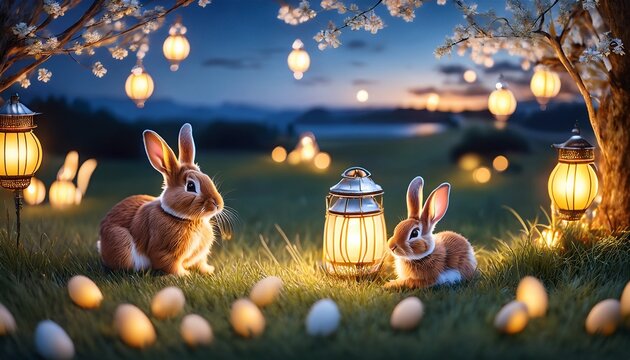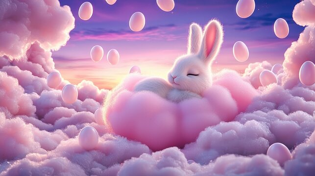 A fluffy white rabbit is prominently placed against a vibrant blue sky dotted with fluffy clouds. This enchanting setting evokes the feeling of springtime and Easter celebrations. Perfect for use in themed marketing materials, holiday greeting cards, and spring-inspired art.