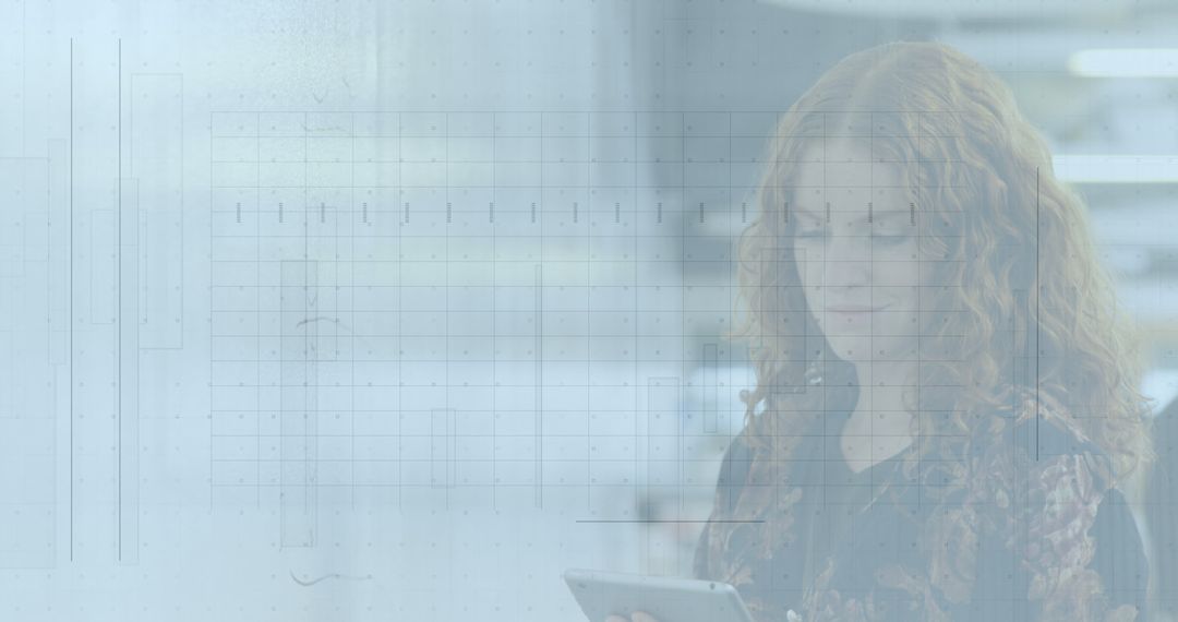 Image features woman interacting with tablet accompanied by digital data overlay, conveying connections between finance, technology, and business industries. Ideal for resources on digital transformation, modern business, technological innovation, or information technology concepts.