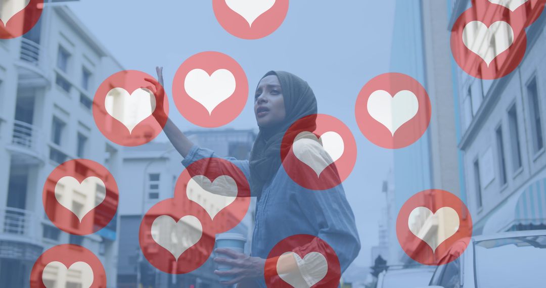 Woman in hijab stood on city street hailing a taxi surrounded by interlaid digital love icons. Represents integration of digital communication with everyday life in urban settings. Useful for concepts surrounding social media influence, modern communication, and urban lifestyle. Perfect for illustrating connecting lives online and offline.