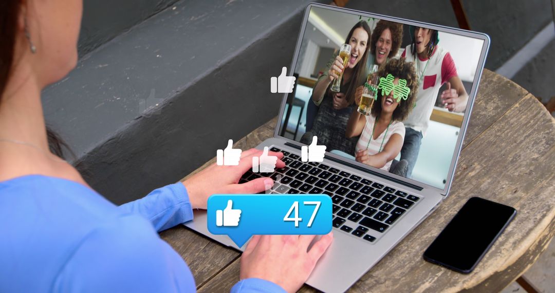 A woman is engaged in a video call with friends on her laptop in a cozy cafe, evident by the rising number of digital 'like' icons on the screen. This modern scene merges real-time virtual interaction with social media engagement. This image is suitable for themes around online communication, social networking, and digital community engagement. It can be used for blog posts, articles, or advertisements focusing on maintaining connections through technology.