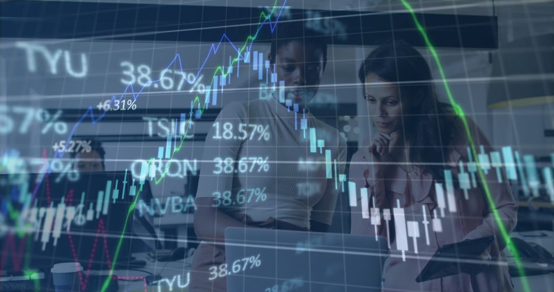 Two diverse women in a modern office setting examining financial charts on a laptop screen. Overlaid graphs and numbers suggest teamwork and analysis in business or finance-related environments. Useful for illustrating concepts of strategy, data analysis, financial seminars, teamwork, and collaborative business processes.