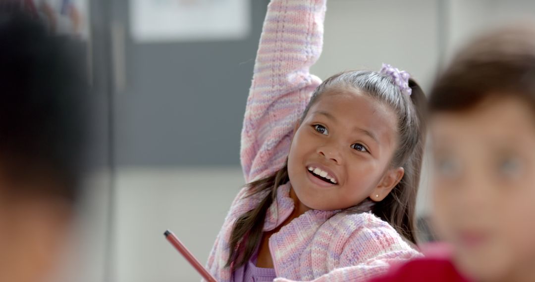 Young biracial girl with long dark hair intently engages during a classroom discussion, enthusiastically ensuring her voice is heard. Her interactive attitude suits educational content emphasizing participation and curiosity while displaying enthusiasm for learning in schools. Perfect for resources showcasing classroom engagement, diversity in education, and inspiring academic environments.