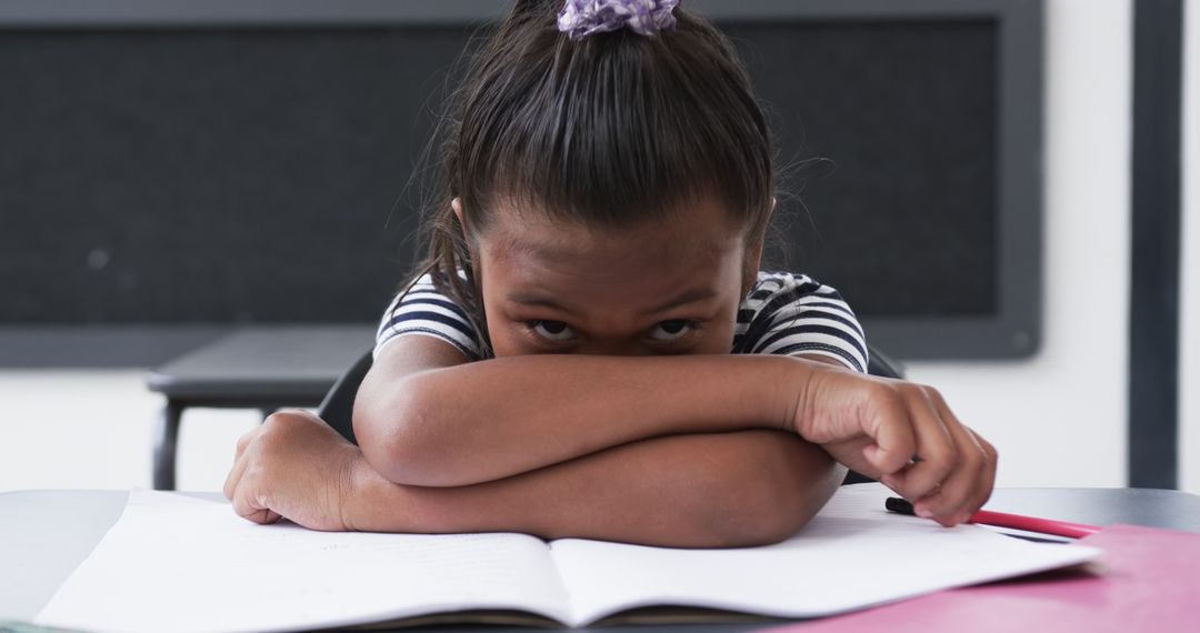 A young girl with a purple hair accessory is resting her head on her arms at a school desk, showing a moment of contemplation or fatigue during study. This image is ideal for educational content or articles focused on school life, concentration challenges, or student routines.