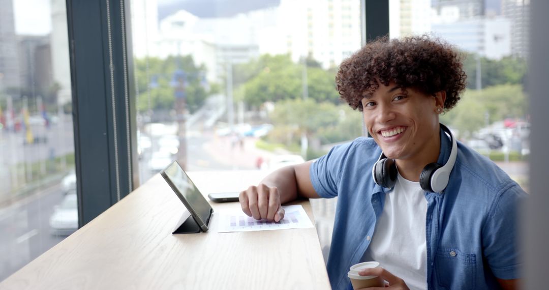 A young man in a casual outfit is sitting by a large window, engaging with technology for work. He has headphones around his neck, smiling as he holds a cup of coffee in one hand and uses a tablet with the other. This portrays a laid-back yet professional atmosphere in an urban setting. Great for concepts related to modern work environments, remote work, technological engagement, workplace flexibility, or startup culture.