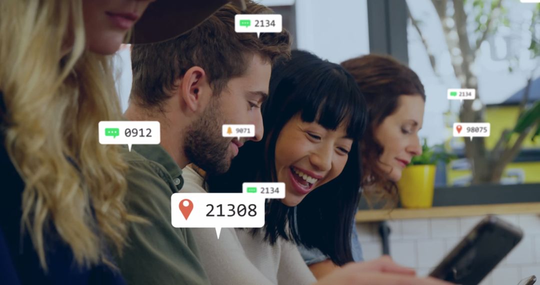 The scene depicts young friends interacting with social media platforms on their mobile devices while enjoying each other's company in a trendy cafe setting. Captured effortlessly, this concept showcases digital connections and modern networking in urban life. Ideal for use in technology promotions, social media campaigns, digital marketing materials, or articles discussing modern communication habits.