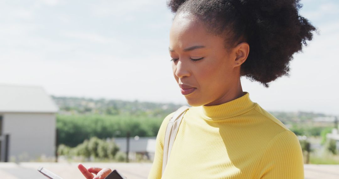 Young African American woman standing outdoors in sunlight, checking messages on smartphone. Ideal visual for social media promotions, tech ads, or lifestyle blogs focusing on technology trends and modern communication. Use in posts about work-life balance, digital connectivity, or casual business storytelling.