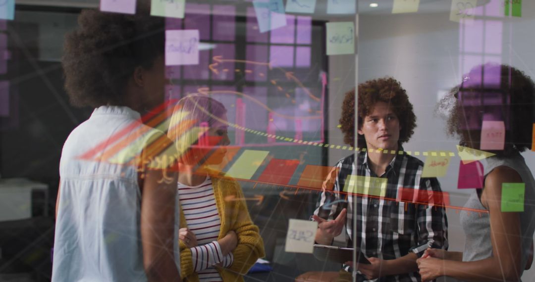 Group of young, diverse professionals engaging in a brainstorming session. Glass wall with vibrant sticky notes, indicating dynamic discussion and planning strategies for business growth and innovation. Ideal for illustrating themes of collaboration, teamwork, and modern business environments. Could be used for articles or marketing material focusing on corporate culture, financial planning processes, or team collaboration.
