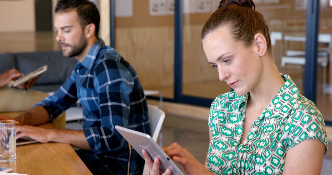 Image illustrates a casual, modern workspace where young professionals are using technology in independent work. Highlights the flexibility and mobility of contemporary work environments, ideal for articles or websites focusing on digital nomad lifestyles, tech-savvy working habits, or collaborative office settings.