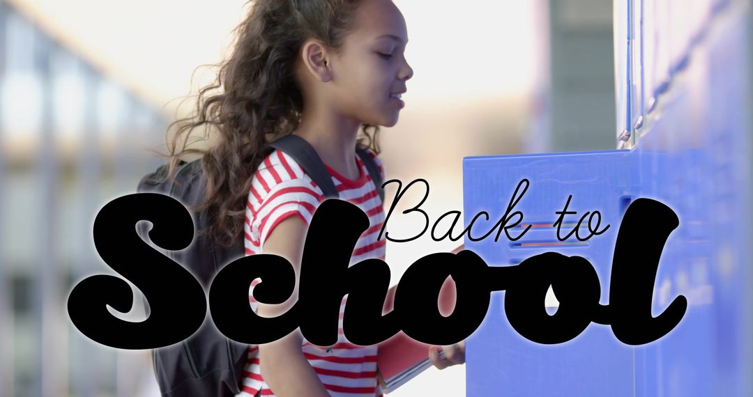 Girl in striped shirt opens locker in school hallway, signaling beginning of new academic year. Ideal for back-to-school promotions, educational content, student-focused advertisements, or materials relating to educational institutions and school-related themes.