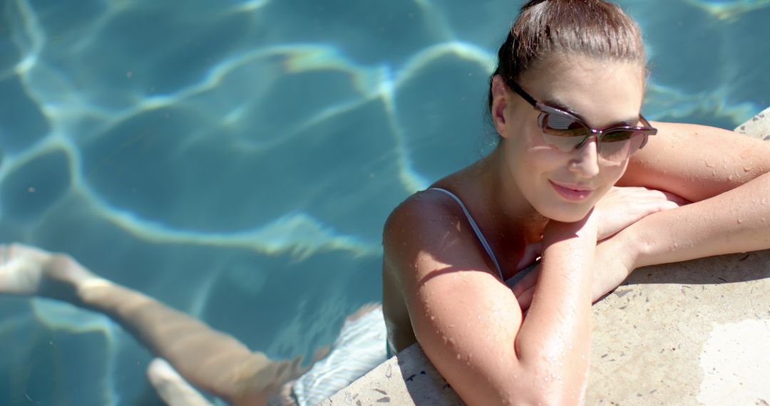- Young Woman Relaxing in a Swimming Pool with Sunglasses