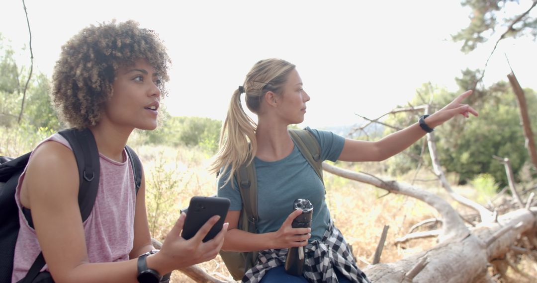 Two young women on a hike through the forest exemplify the blend of outdoor adventure and modern technology. One is pointing at a smartphone, highlighting the significance of digital maps in exploring nature. Perfect for promoting travel apps or outdoor clothing brands and inspiring stories about friendship, exploration, or modern adventure.