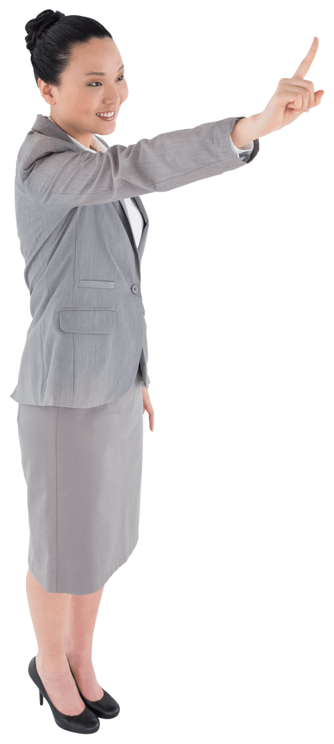 Asian businesswoman in business attire pointing upward while smiling, captured on transparent background. Perfect for illustrating professional concepts, presentations, or advertisements that emphasize progress, growth, and successful business strategies.
