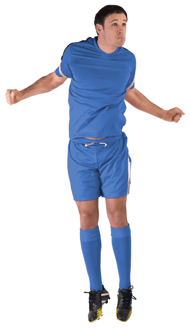 Athletic Football Player in Blue Uniform Jumping with Energy Transparent PNG