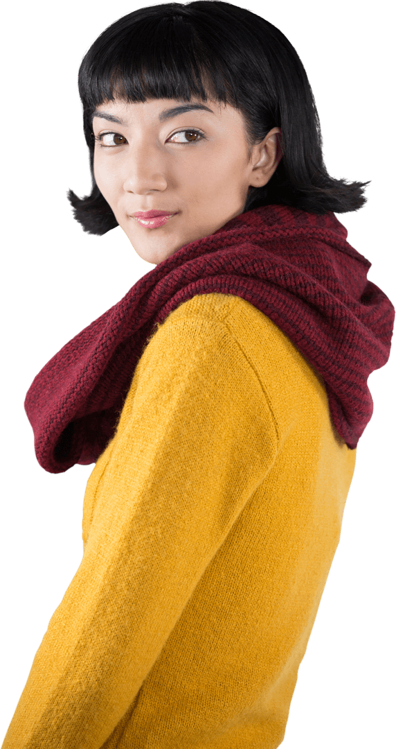 Stylish woman wearing winter clothing, featuring a red scarf draped over a mustard sweater. She is casually looking back against a transparent background, which is ideal for design projects needing easy incorporation. This image can be used in fashion blogs, seasonal advertising campaigns, or social media posts showcasing winter fashion while retaining a minimalistic and versatile layout.