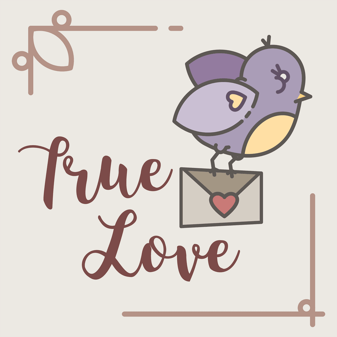 Illustration shows cartoon bird carrying heart-adorned letter with 'True Love' text, conveying feelings of romance. Ideal for Valentine's Day cards, love-themed projects, or digital art collections with romantic concepts. Use for expressive designs focusing on love and affection.