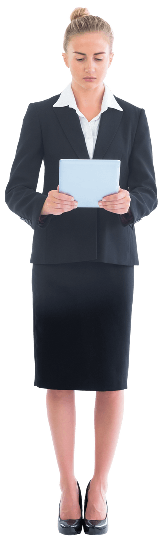Businesswoman in professional attire engaging with a tablet device on a transparent background. Ideal for business-related promotions, presentations, digital workflows, marketing materials, or featuring women in tech and professionalism.