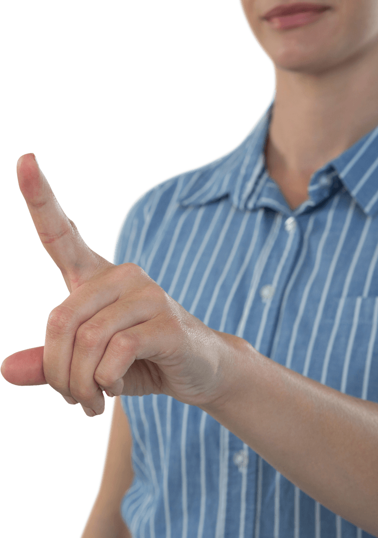 Businesswoman pointing finger upward on transparent background offers versatile usage. This is perfect for business presentations, website visuals, user interface elements, or demonstrating interactive technology concepts.