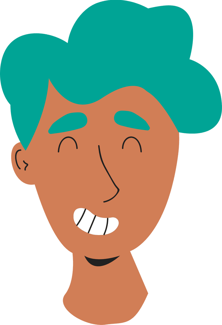 Minimalist vector illustration showing playful male character with distinctive teal hair and a wide, toothy smile. Self-expression evident with cheerful demeanor captured in digital style. Ideal for conveying positivity and lightheartedness, use this image in digital storybooks, fun blog posts, mobile games.