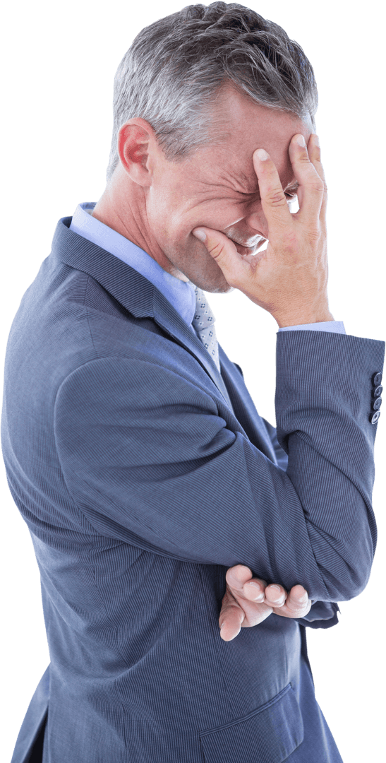 Caucasian businessman in gray suit visibly facepalming, portraying frustration or stress. Featuring attractive transparency for diverse usage in presentations, blogs, or articles conveying themes of professionalism, stress management, or workplace challenges.
