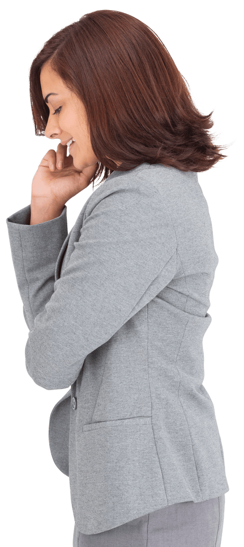 Businesswoman engaged in positive phone conversation while wearing gray suit. Useful for illustrating communication concepts, business presentations, or conveying a professional atmosphere. Transparent background makes it versatile for use in design projects or marketing materials.