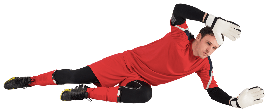 Caucasian male goalkeeper in vibrant red uniform and gloves is captured mid-action while making an impressive sideways dive on transparent background. Ideal for sports articles, fitness posters, or technique illustrations. Use to emphasize determination and agility in soccer-related content.