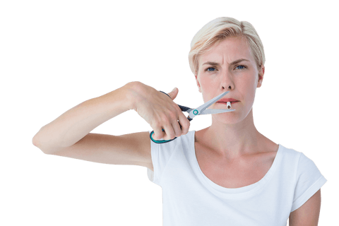 Caucasian Woman Cutting Cigarette on Transparent Background PNG