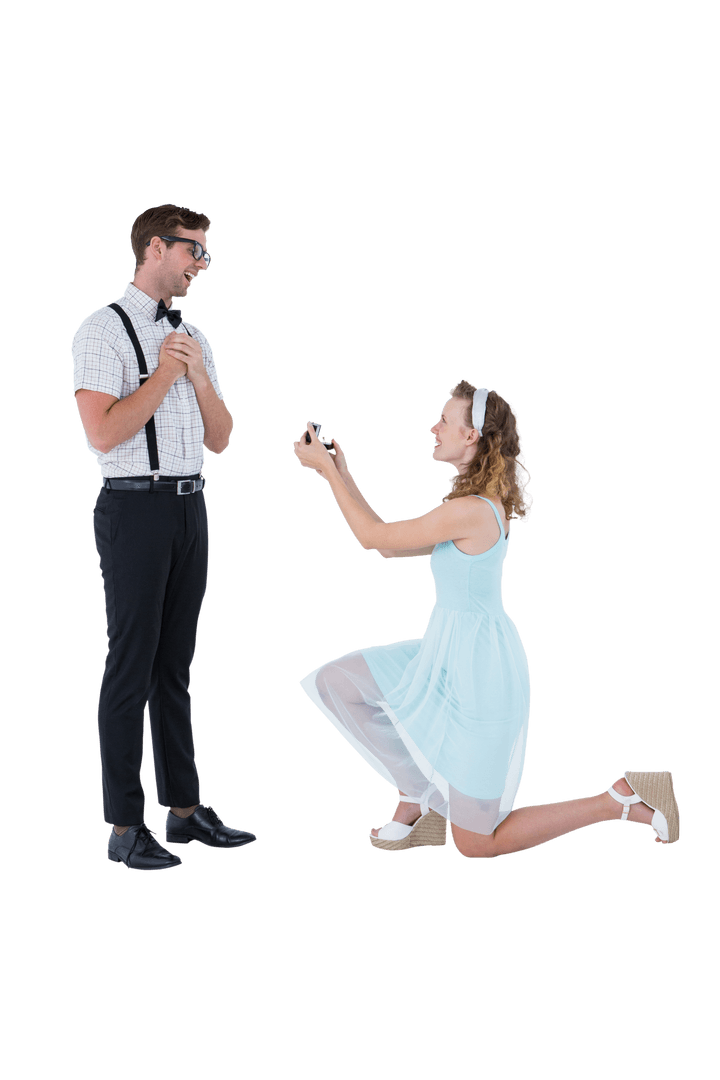 This transparent background image shows a Caucasian woman on one knee proposing with an engagement ring held in front of a young man. Highlighting modern romantic dynamics, this image is perfect for use in relationship blogs, engagement announcements, romantic articles, or printed on various backgrounds. Its transparent nature allows for effortless integration with different projects, including wedding invitations, social media featuring love-themed content, or articles about changing roles in relationships.