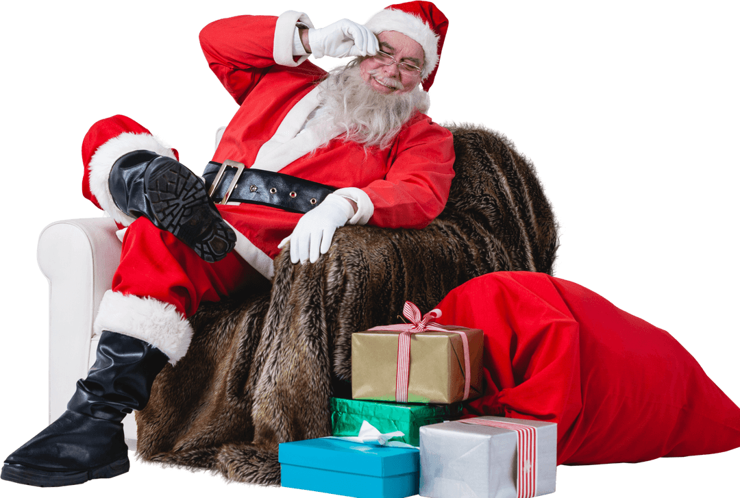 Santa Claus is sitting comfortably on a sofa with confidence, surrounded by an array of beautifully wrapped Christmas gifts and a classic red sack. Ideal for holiday-themed designs and enhancing festive marketing materials requiring a transparent background.
