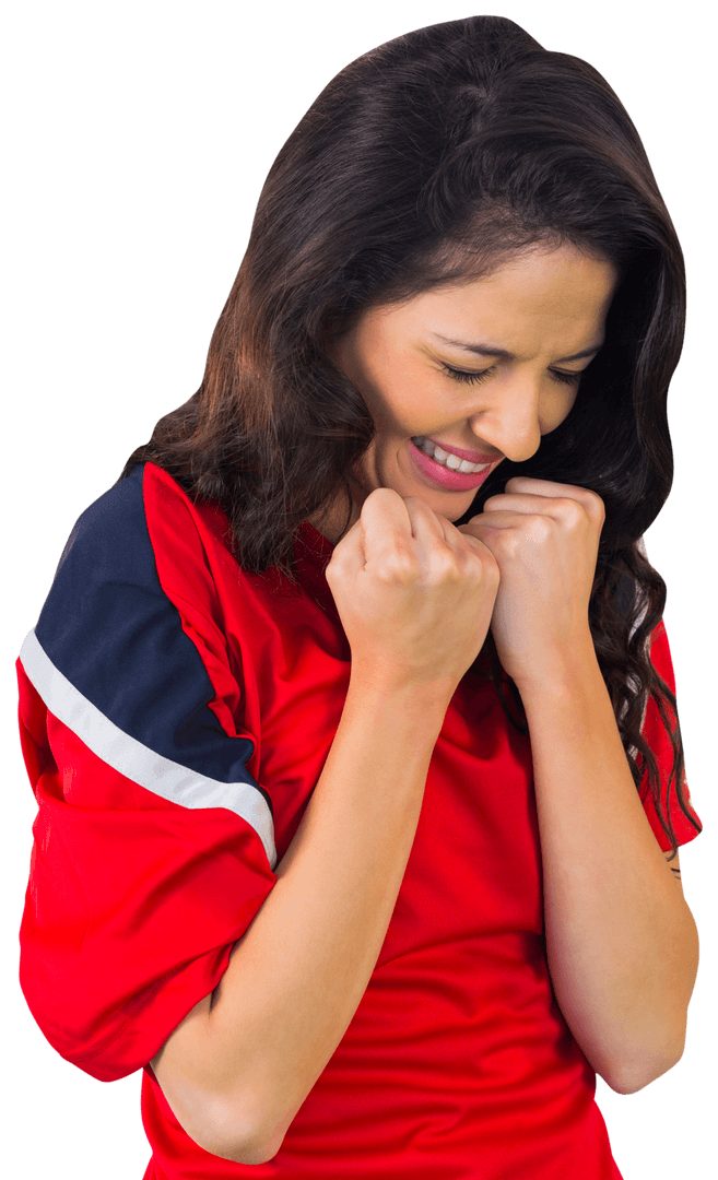 Image features a female sports enthusiast passionately celebrating a win in a vibrant red jersey. Ideal for sports promotion, fan euphoria illustrations, or energetic advertisements highlighting team spirit. Suitable for use in merchandising for sports events, decoration for fan zones, or as a motivational graphic.