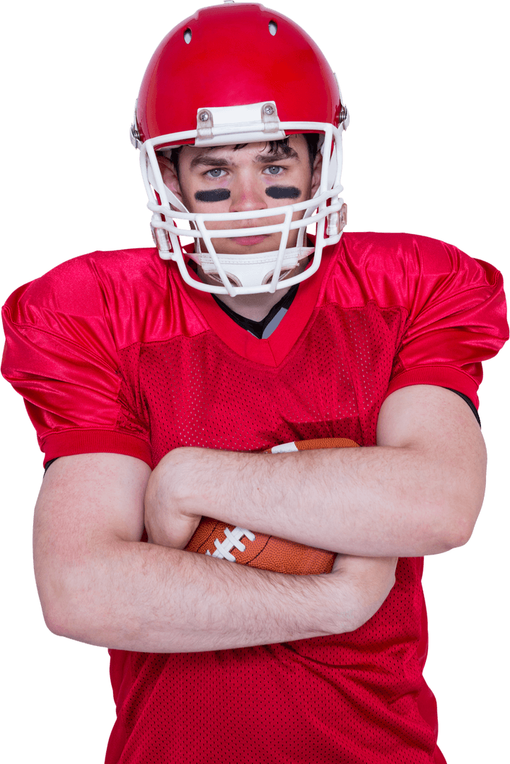 This image shows an American football player in a red uniform, confidently standing with arms crossed while holding a ball. The player wears a helmet and has a competitive expression, perfect for sports-themed projects, advertising campaigns, or motivational posters portraying strength and determination.