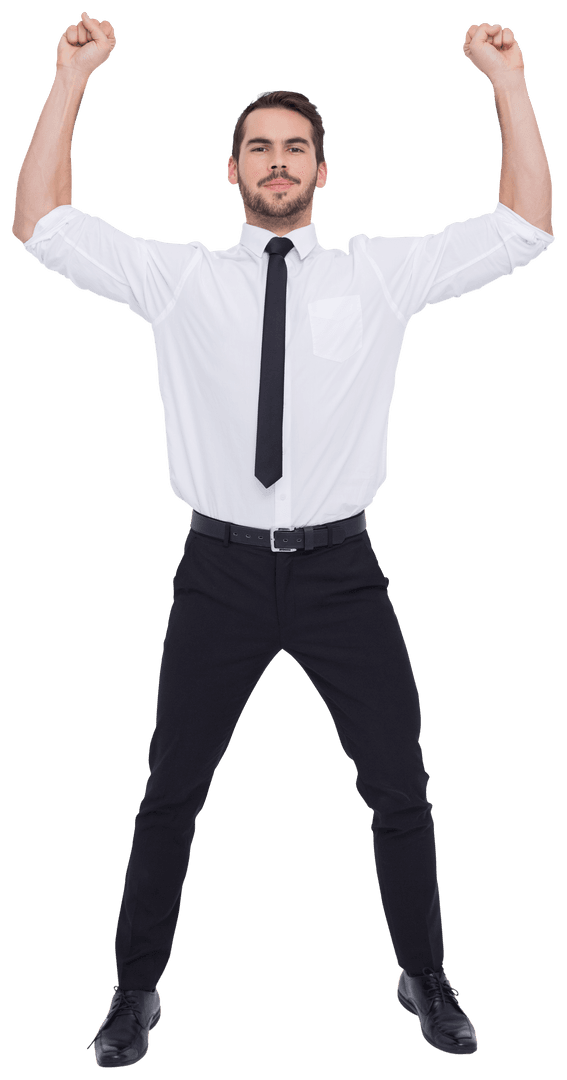 Image shows a businessman in formal attire confidently lifting an invisible weight against a transparent background. This can be useful for presentations, motivational content, business promotions, or marketing campaigns promoting strength and confidence in work settings.