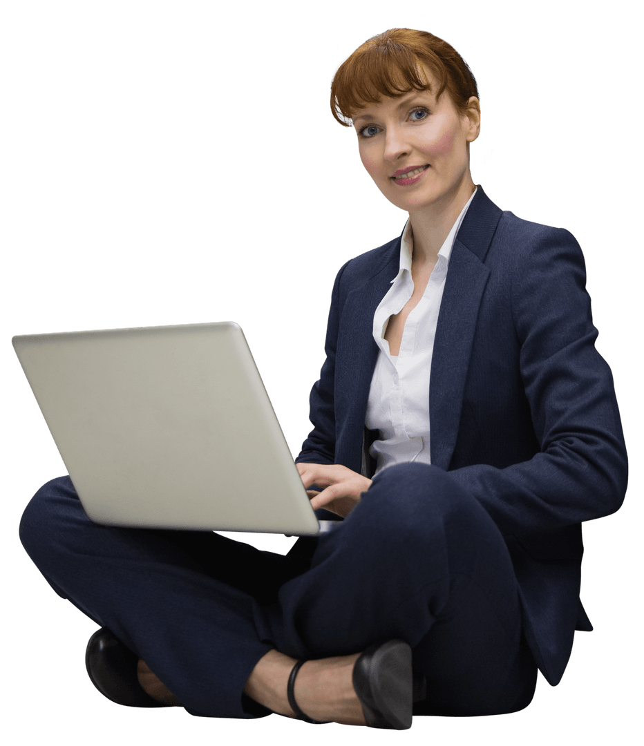 Caucasian businesswoman in formal attire sitting cross-legged using laptop. On a transparent background this is ideal for advertising, business presentations, or web projects.