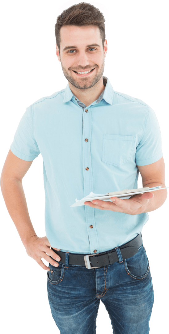 Man confidently holding a clipboard, wearing casual jeans, emitting friendliness and approachability. Ideal for business and service proposals, highlighting positive interactions with clients. Use for promotions in customer service and support tutorials that showcase professional enthusiasm.