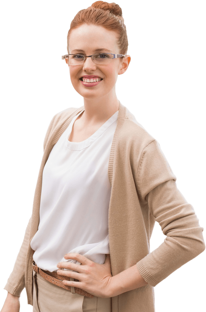 Young adult woman with red hair and glasses looking confident while standing with a smile. This transparent background image is ideal for professional presentations, recruitment materials, or marketing content emphasizing confidence and professionalism.