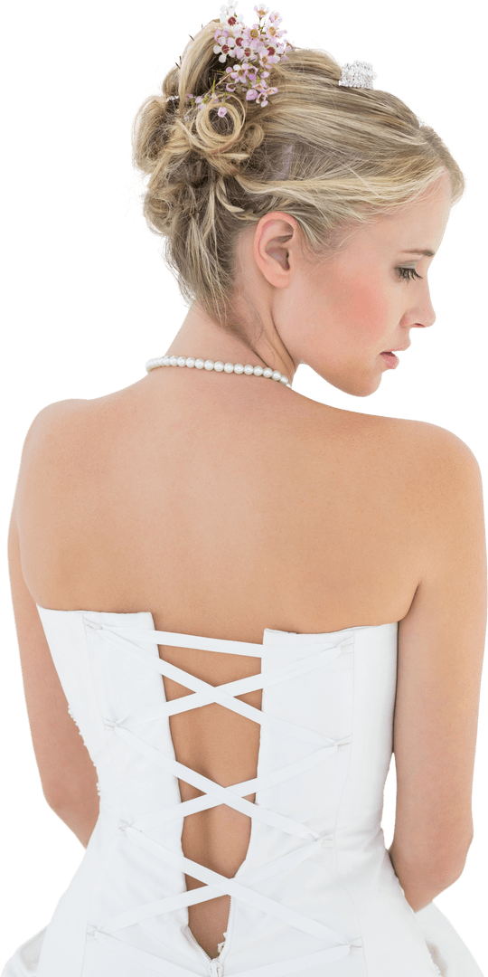 Transparent design perfect for wedding invitations, websites, and blogs focused on bridal fashion. Highlights back details of gown and intricacy of bridal hair updo, adding elegance to wedding-related digital or print media.