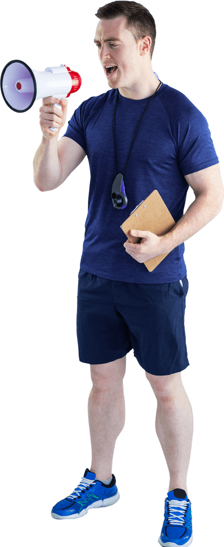 Energetic Male Coach Yelling Motivations Through Transparent Megaphone PNG