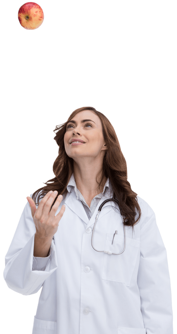 Female doctor in white coat joyfully juggling apple against transparent background suggests focus on health and nutrition. The image can be used for promoting health awareness campaigns, nutritional advice, wellness programs, or educational content related to achieving balanced lifestyles.
