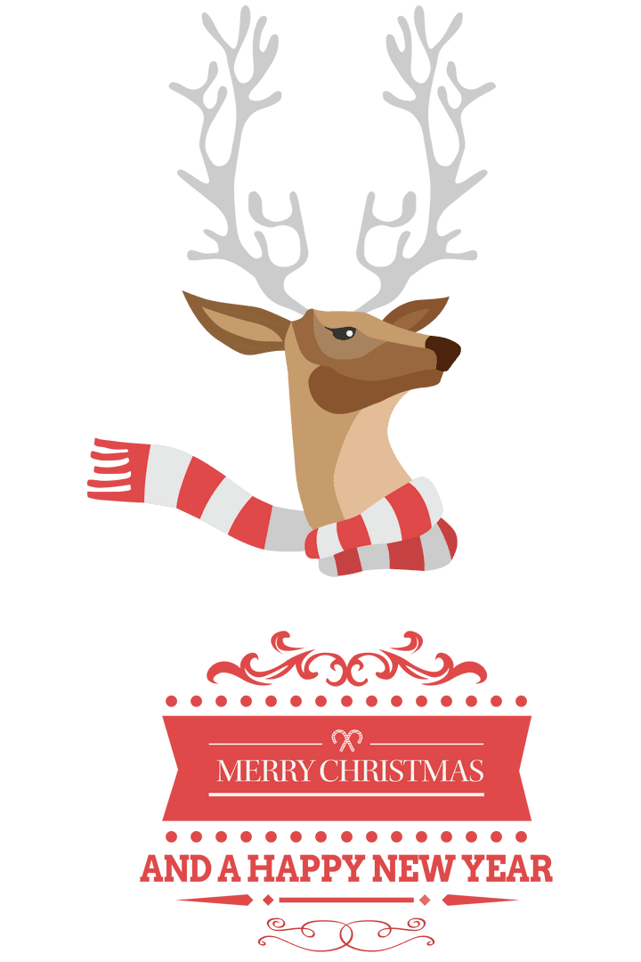 This transparent illustration features a festive reindeer with large antlers and a red and white striped scarf, conveying a Merry Christmas and a Happy New Year message. The decorative border and classic colors make it ideal for creating custom holiday greeting cards, digital invites, or festive decorations. Its transparent background allows easy integration into various graphic design projects or seasonal merchandise.