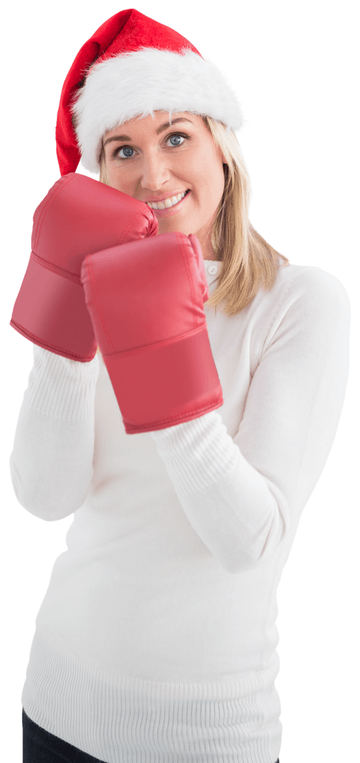 This image shows a joyful woman celebrating the holiday season by wearing a Santa hat and red boxing gloves amidst a transparent backdrop. Ideal for promotional material celebrating Christmas with a fun and energetic twist, or for greeting cards and posters that mix sports with festive joy.