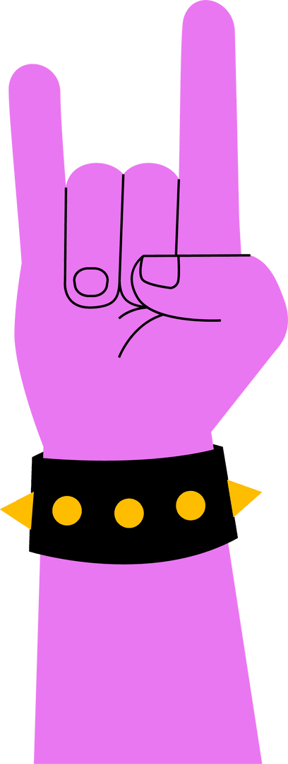 Illustration presents a flat purple hand making the rock horns gesture with a spiked leather wristband. Transparent background enhances its versatility for composite designs in posters, merchandise, event flyers or vibrant graphic art focusing on punk and rock culture themes.