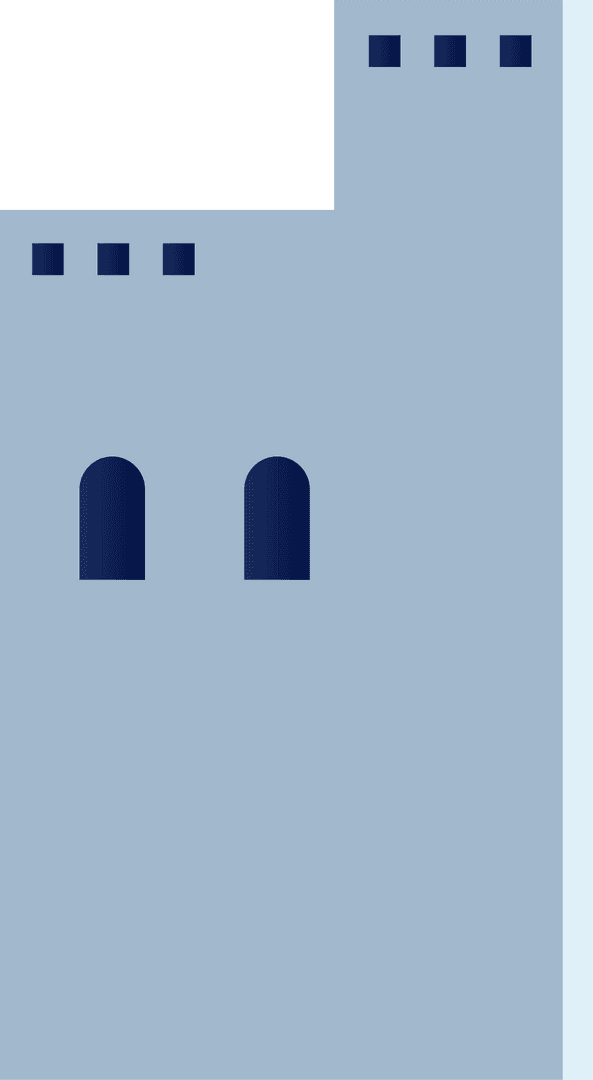 This graphic features a stylized medieval fortress turret floating on a transparent backdrop with a blue block design. Visible details include openings and battlements, emphasizing themes of defense, security, and historic architecture. Useful for design projects focused on medieval times, transitional graphic overlays in historical presentations, or educational materials about castle structures.