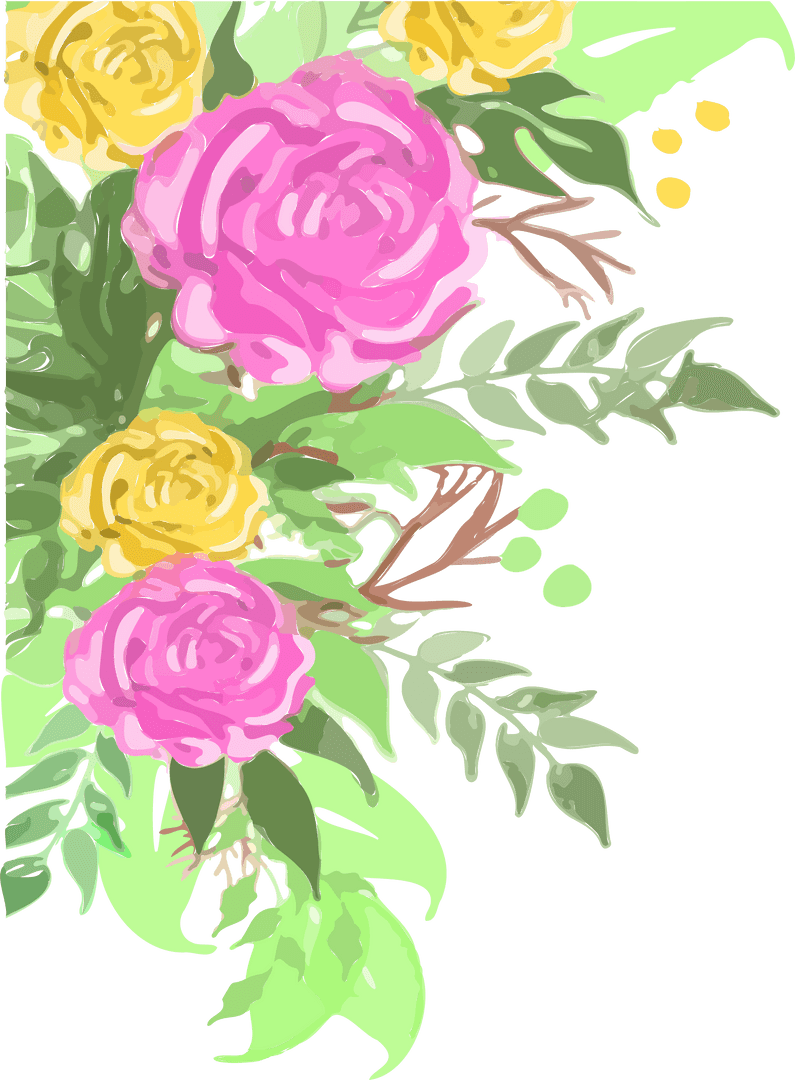 This flat design captures a vibrant display of pink and yellow rose blooms intertwined with green foliage and berries on a transparent layout. Perfect for eco-friendly design projects, stationery, invitations, or any decorative elements needing a vintage floral touch. The transparency adds versatility for layering in digital artworks or enhancing organic-themed brands.