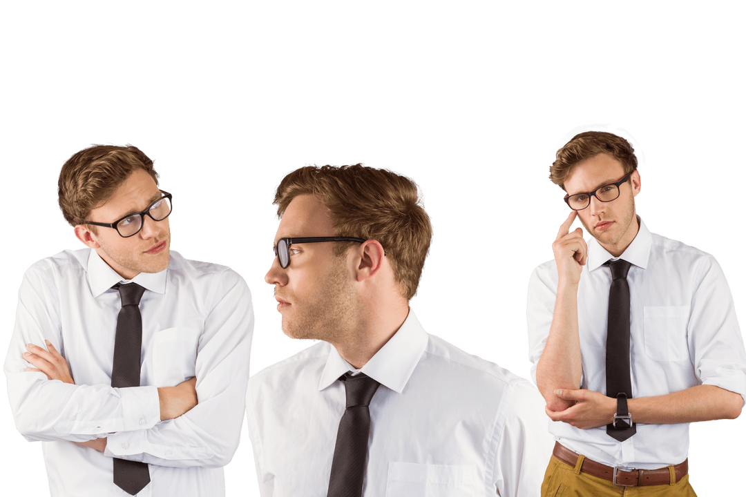 This design features three instances of a focused Caucasian businessman wearing a white shirt and dark tie, each displaying a different thoughtful pose. The transparent background allows for seamless integration into various projects, such as professional presentations, business cards, or corporate websites. The images can effectively convey concepts like professionalism, decision-making, or strategic planning in commercial and personal creative projects.