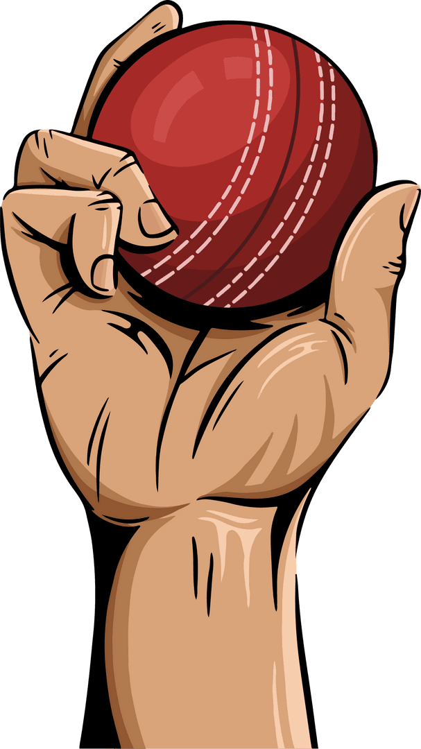 Flat illustration of a human hand holding a red cricket ball features bold lines and simple shapes against a transparent backdrop. Designed to highlight the relationship between athlete and sporting equipment, it captures dynamism and minimalism. Perfect for use in sports-related projects, design work, infographics, and educational materials.