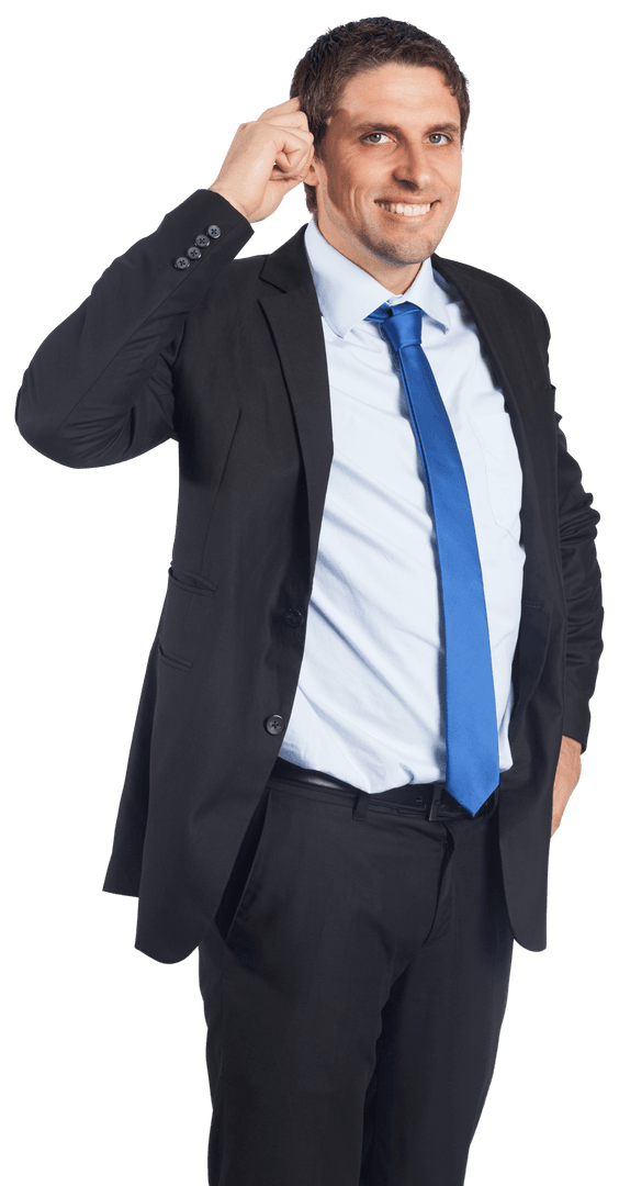 Image of smiling businessman wearing a formal suit and bright blue tie, scratching head on a transparent background. Ideal for business concepts, professionalism, corporate communications, presentations, promotional materials, and advertising campaigns focusing on problem-solving or strategy development.