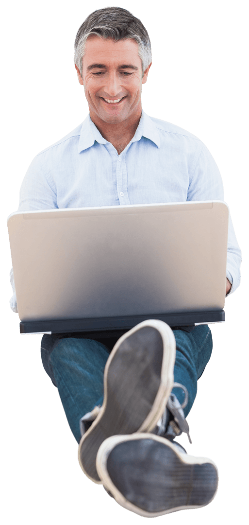 Mature man wearing casual attire happily using laptop while sitting against transparent background. Perfect for illustrating concepts of remote work, technology engagement, or promotional materials involving senior audiences.