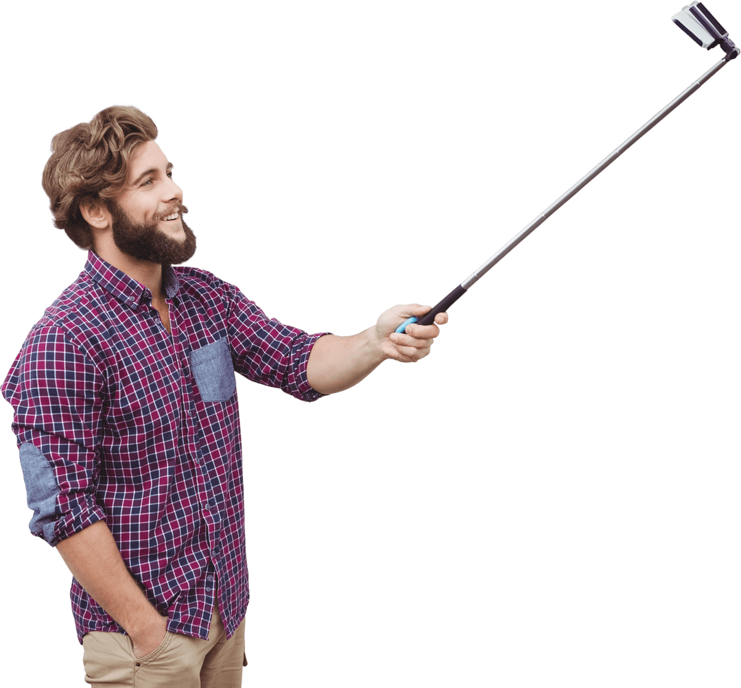 Young man with beard holding selfie stick, likely appreciating technology of capturing moments. His relaxed pose in casual attire suggests a friendly, approachable personality. This can be used for advertisements promoting youthful lifestyles or tech gadgets. Transparent background makes it versatile for various designs.