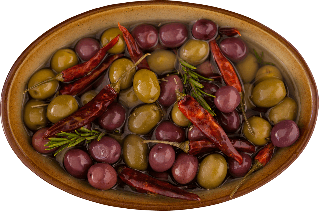 Olives in Transparent Oil with Chili Peppers and Fresh Herbs PNG