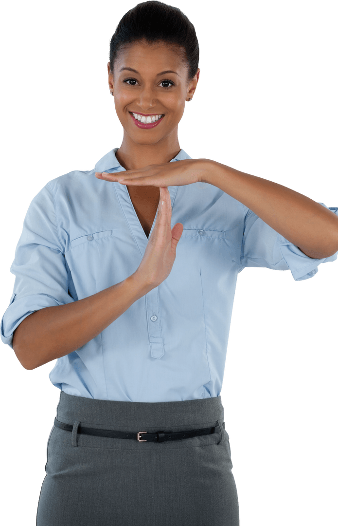 Businesswoman confidently smiling while making a time out gesture on a transparent background. Ideal for use in business presentations, communication material, workplace team building content, and work-life balance promotions.