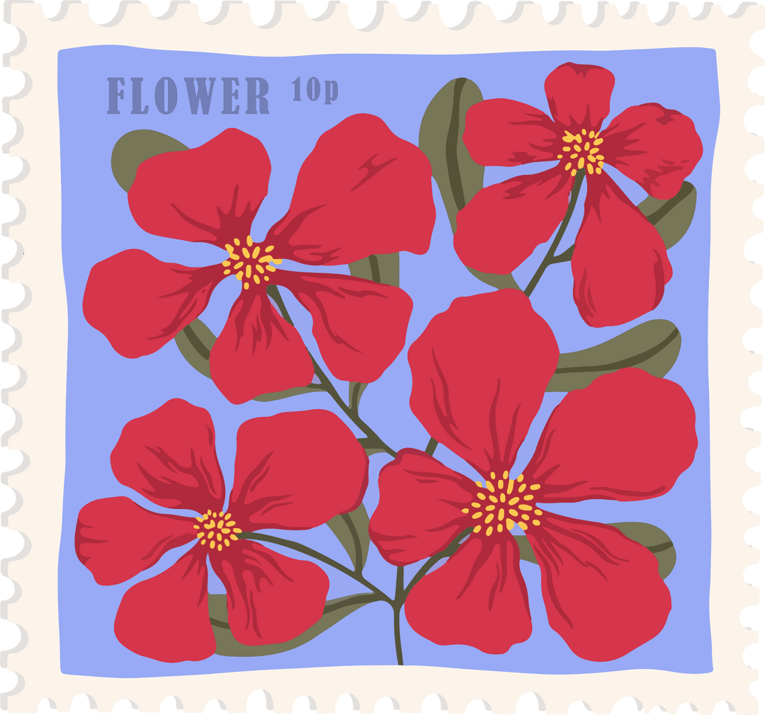 Red flower stamp with a vintage design features perforated edges and a serified FLOWER 10p label against transparent background. Ideal for botanical-themed designs, vintage collections, educational materials on stamp collecting, art prints, web graphics, or decorating scrapbooks. Emphasizes botanical beauty and creates a classic aesthetic.